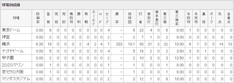 ハマスタ 18.1回 防御率6.38 被打率.288 被本塁打3本 WHIP1.47