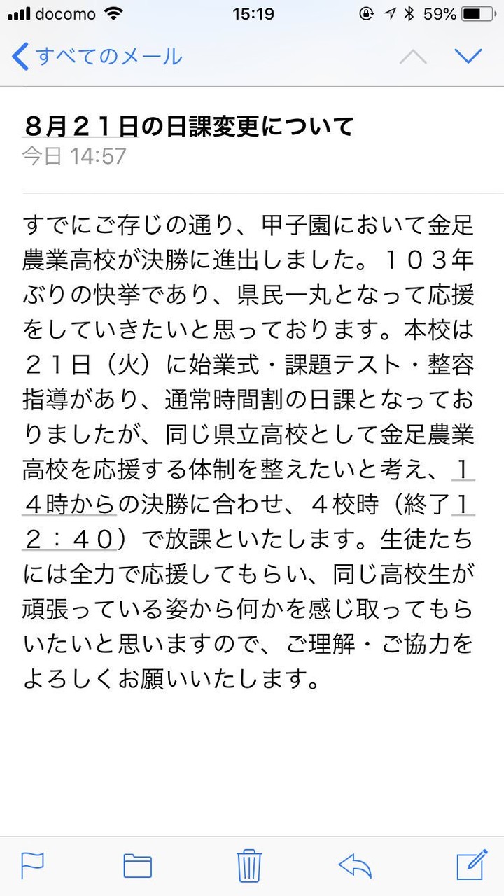 「金足農を全力で応援しよう」秋田の県立高校が明日の時間割を午前で打ち切り