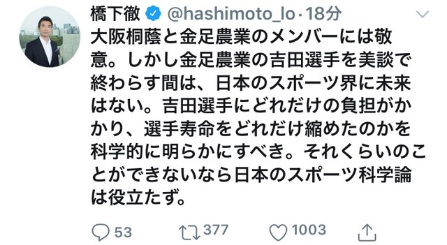橋下徹氏「今回の大会で金足農業の吉田選手の選手寿命がどれだけ減ったか科学的に明らかにすべき」