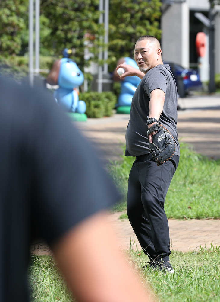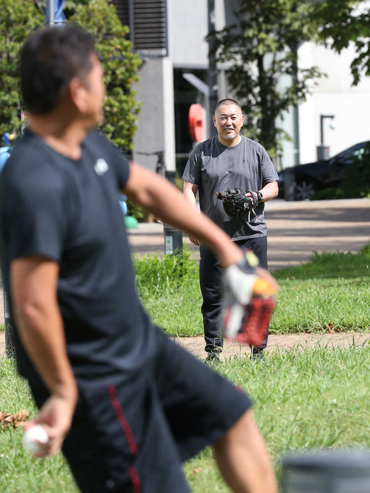 練習パートナーに、という佐々木氏からの願いを清原氏は快諾した。「うれしいね。ボールに触るのも、もう何年も触っていない」。引退まで使った「Kiyo」と刺しゅうされた黒いファーストミットをはめた。短い距離に始まり、間隔を広げていった。