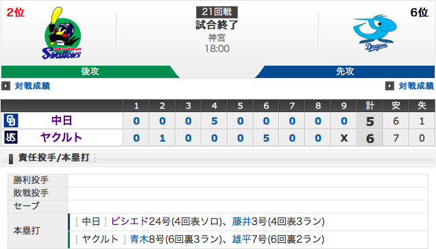 【試合結果】中日 5-6 ヤクルト ビシエド24号&藤井3号HR