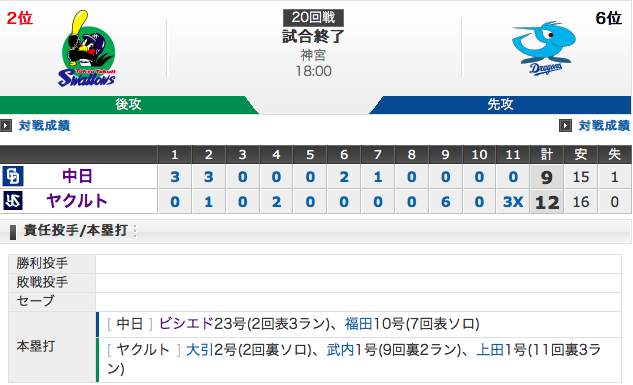 【試合結果】中日 9-12 ヤクルト 夏の神宮恒例のやつ