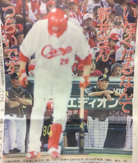 ・【悲報】金本監督、引退を決断した新井さんを寂しそうな目で見つめる