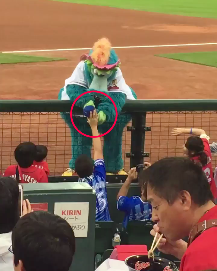 ■広島カープのマスコット・スラィリーがラミレス監督の人形を横浜ファンの女の子から奪い、横浜DeNA選手&監督とハイタッチして返し、笑顔にするファンサービス。※スターマンの人形を持っていく場合もある。