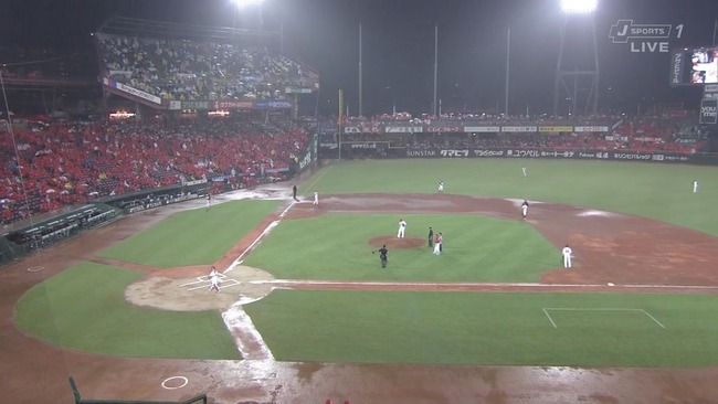 マツダスタジアム、雨で試合開始が1時間遅延→雨で試合中断→1時間以上待ってやっと再開。今から3回表へ・・・