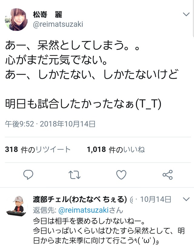 【松嵜麗】ちなヤクおばさん「明日も試合したかったなぁ。心が元気でない。」