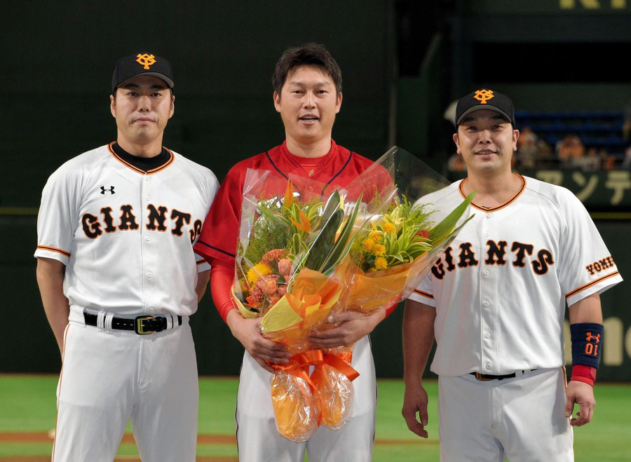 今季限りでユニホームを脱ぐ広島・新井が試合前に巨人・上原と阿部から花束を受け取った。