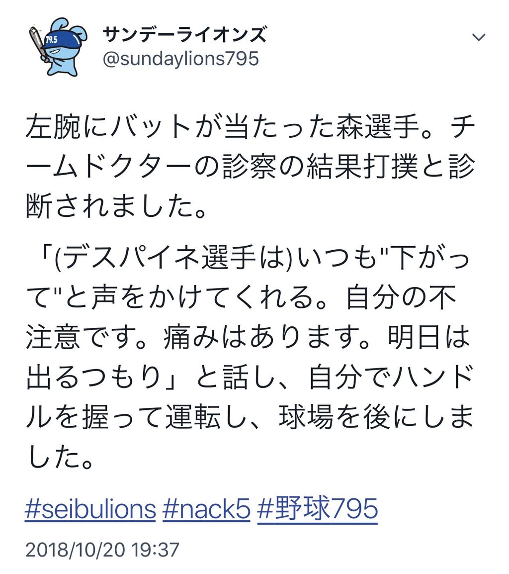 (出典 西武・森友哉「デスパイネはいつも危ないから下がってと声をかけてくれる 完全に自分の不注意でした」)
