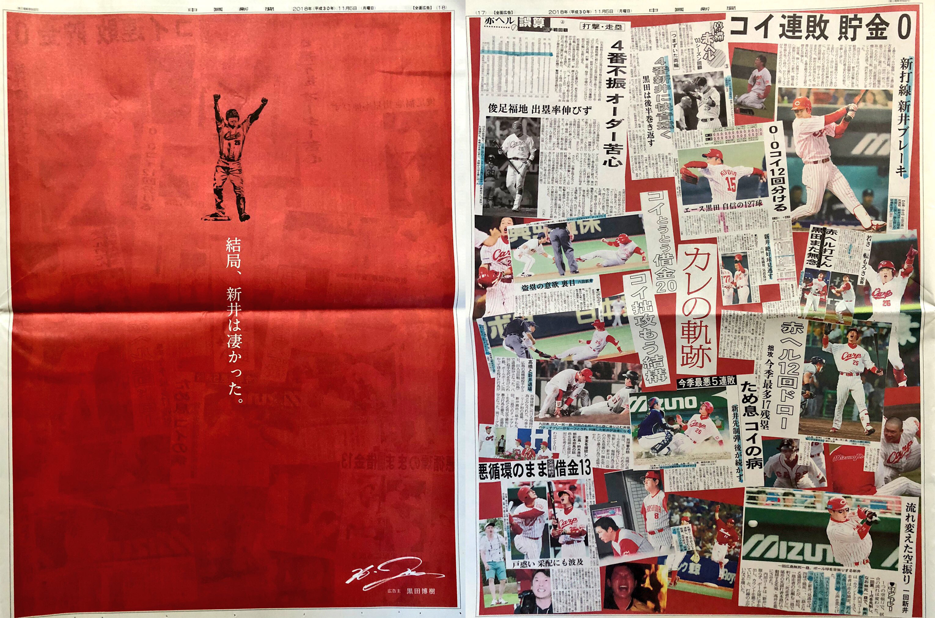 ■元広島カープ・黒田博樹、引退した新井貴浩を労う感謝の全面広告を自費で中国新聞に掲載。