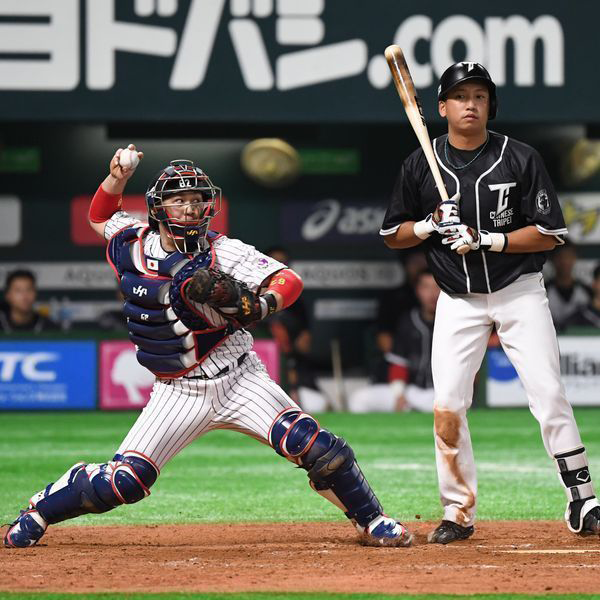 6点ビハインドで、山崎とのバッテリー。1死から台湾で今季44盗塁をマークした盗塁王・王威晨に中前打を許した。