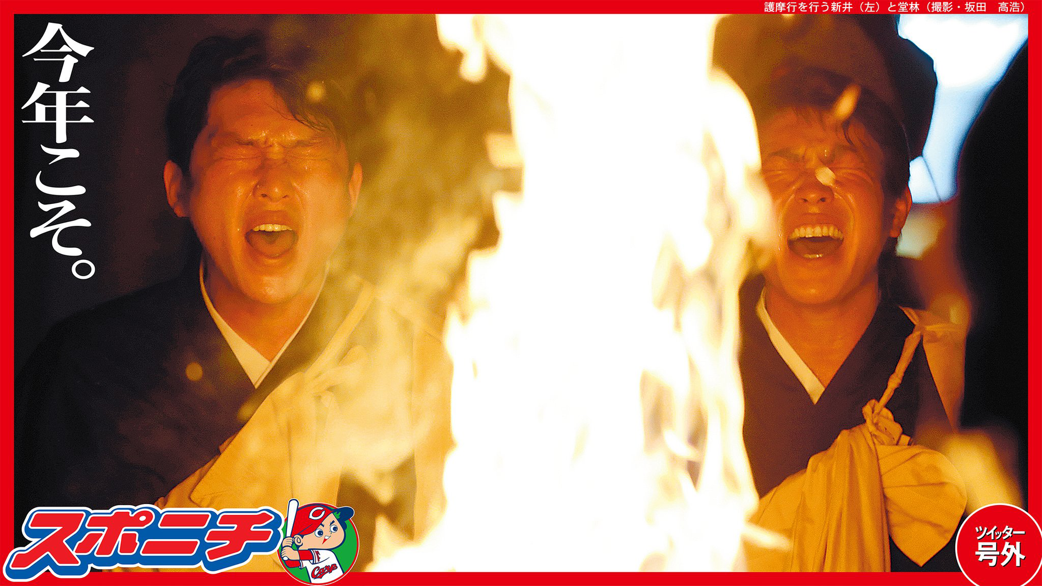 今年も護摩行じゃ!!!!!!!!!!!#新井さん をはじめ #石原、#会沢、#堂林 が、高野山の炎の前で18年シーズンへ向け気持ちを引き締めました。写真を早速お届け。この気合の表情、今年こそ日本一になるという思いで満ちています!#carp pic.twitter.com/V8H1GAcQRP