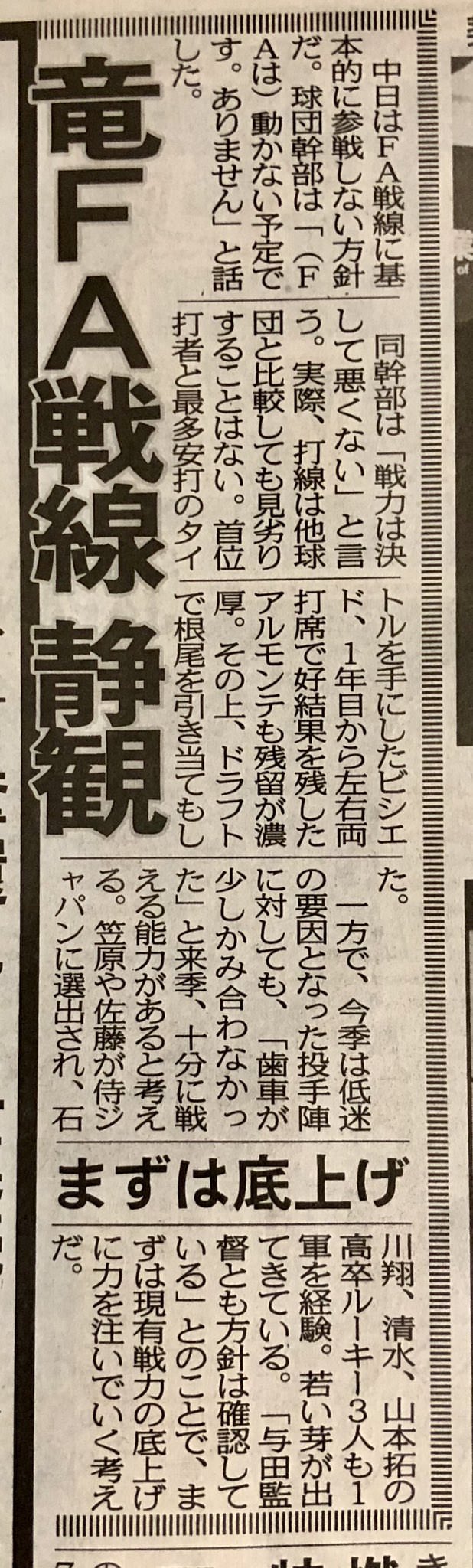中日、FA戦線静観「戦力は決して悪くない」