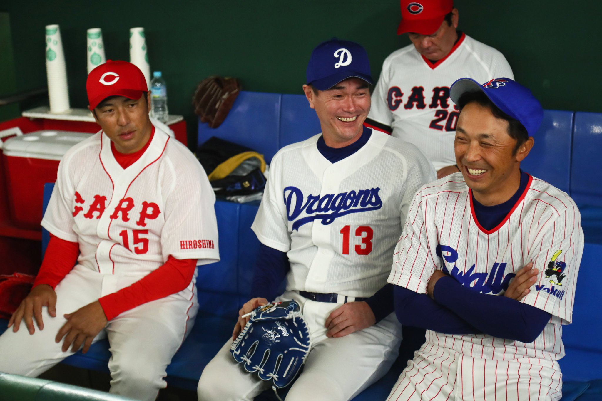 この3ショットも貴重ですよね。名球会セ・パ対抗試合(東京ドーム)に出場した #黒田博樹 氏 #岩瀬仁紀 氏 #宮本慎也 氏 (撮影・足立雅史)