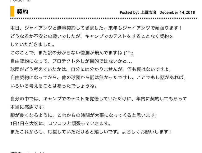 ※「契約」上原投手のブログより