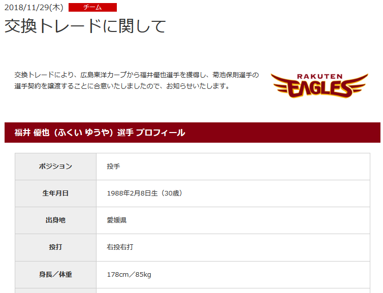 楽天は29日、広島東洋カープから福井優也を獲得し、菊池保則の選手契約を譲渡することを発表した。