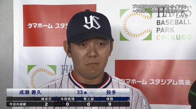 成瀬は今季、12試合に登板し0勝1敗、防御率5.40だった。今オフに自由契約となった際には「野球は今しかできない。