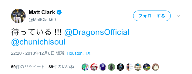 9日に再び日本語で投稿し「@DragonsOfficial」と添えた。
