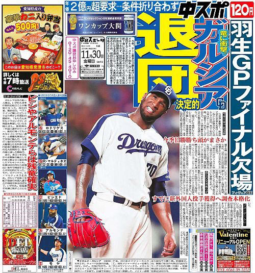 昨日中スポ「根尾、ラーメン!w」キャッキャキャッキャ 今日中スポ「ガルシア退団…」