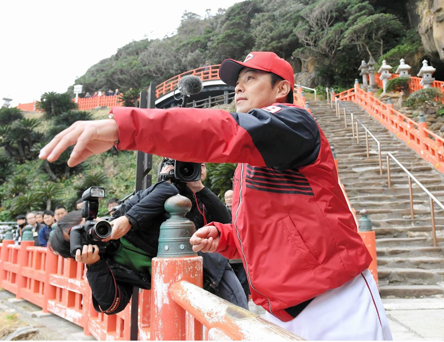 広島の緒方孝市監督(50)、水本勝己2軍監督(50)、会沢翼選手会長(30)が5日、宮崎・日南キャンプ第2クール初日の練習前、同市内の鵜戸(うど)神宮に参拝。高さで9メートル下、奥行きで10メートル先の崖下にある「枡」(ます)と呼ばれる直径約30センチの石のくぼみに、粘土の素焼きで作られた「運玉」(うんだま)を左腕で5投し、命中すれば願いがかなうと言われている恒例の願掛けを行った。