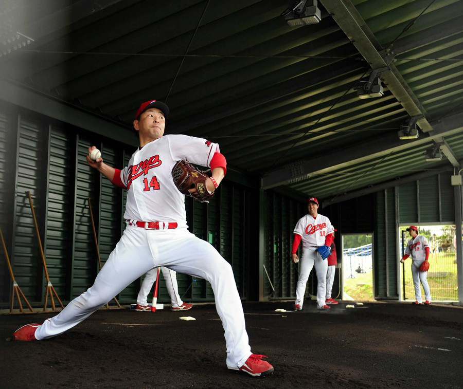 温暖な沖縄で始まった2次キャンプ、大瀬良が鋭いまなざしで腕を振り続けた。新設されたコザしんきんスタジアムのブルペンで計130球。「セットポジションのフォームを固めたい」と直球にカットボールなどの変化球を交え投げ込むと、捕手の後ろからは視察に訪れた斎藤雅樹氏から熱い視線を送られた。