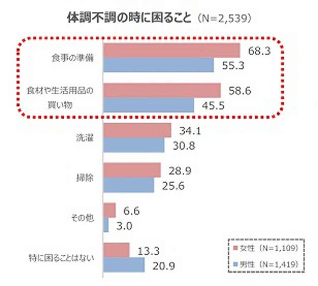 体調不良時に最も困ることは「食事の準備」で、次いで「食材や生活用品の買い物」と、食事にまつわる家事が上位を占めています。男女別で見ると、「洗濯」や「掃除」での男女差は5ポイント未満だったのに対し、「食事の準備」「食材や生活用品の買出し」については男性より女性の方が10ポイント以上高い結果となりました。 体調不良時の食事の準備について、男性は「出前を利用する」がトップでしたが、女性の1位は「デパートやスーパー、コンビニなどで購入する」。