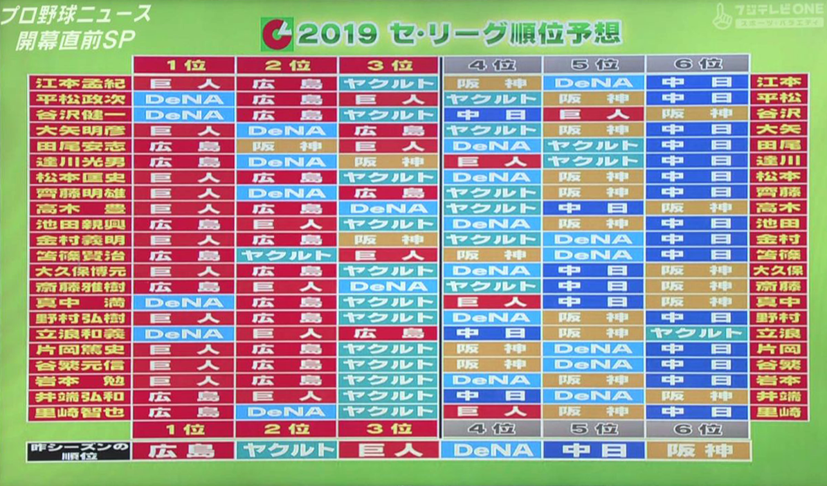 プロ野球ニュース順位予想1位→カープ7人、巨人11人、DeNA4人