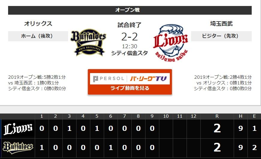 2019.3/13-試合結果【西武×オリックス】(大阪シティ信用金庫スタジアム)は2-2で引き分けで終了