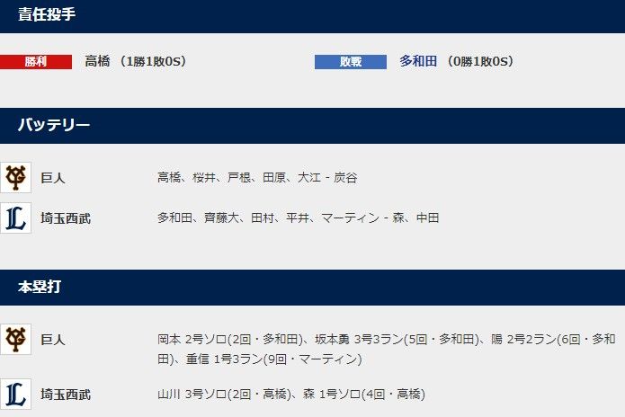 2019.3/21-試合結果【西武×巨人】(メットライフドーム)は2-13で西武が負け・・・先発、多和田が7失点で開幕投手に不安を残す結果に。。