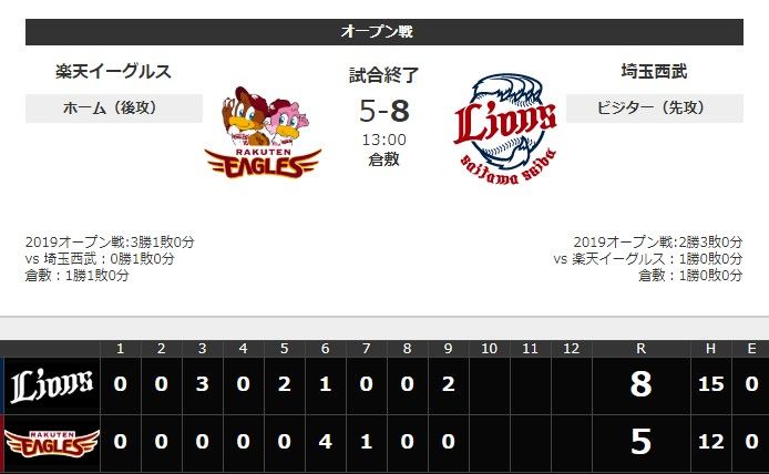 2019.3/9-試合結果【西武×楽天】(倉敷)は8-5で西武が勝ち!!オープン戦デビューの先発、松本航が4回2安打無失点の好投!!山賊打線が15安打8得点と爆発!