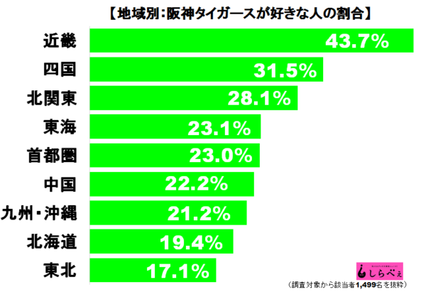 関西では絶大な人気を誇る阪神。当然近畿地区では好きな人の割合が高いはず。