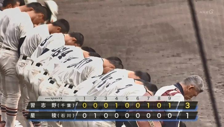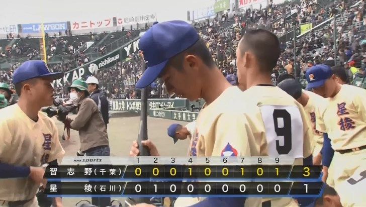 一方、エース奥川は3回までに無安打投球。しかし、習志野は4回にポテンヒット2本でチャンスを作ると、竹縄がライトへのタイムリーを放ち、同点とした。その後、2死満塁とするも、兼子は中飛。奥川が踏ん張り、勝ち越しはならなかった