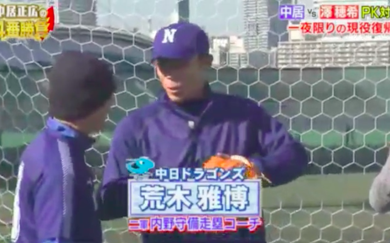 中日荒木コーチ、ゴールキーパーでザル守備を披露