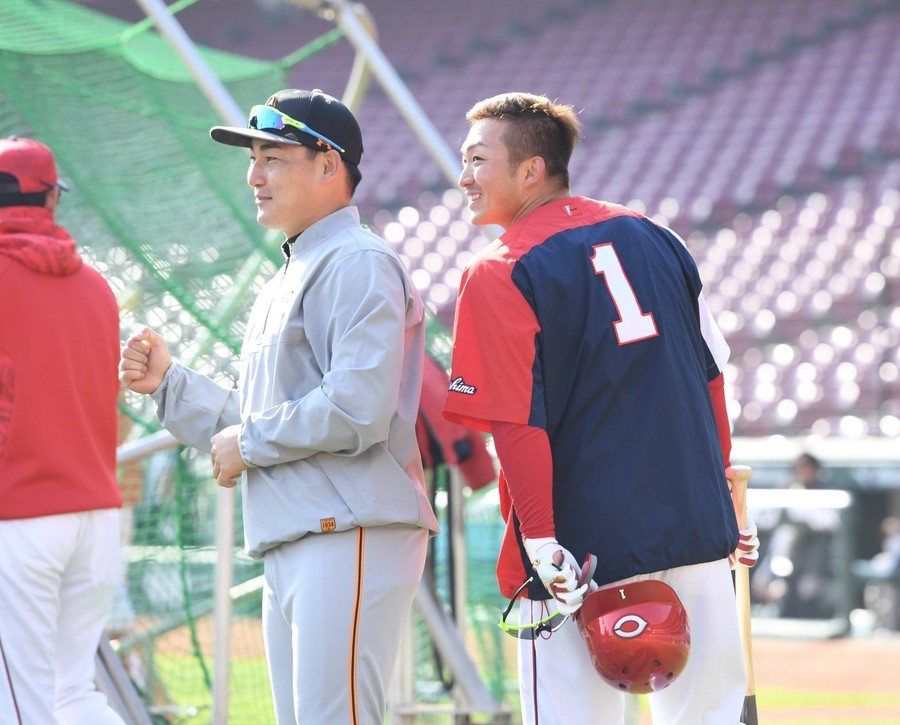 巨人丸、カープの元同僚鈴木誠也から肩をモミモミ 対戦前にあいさつ回り
