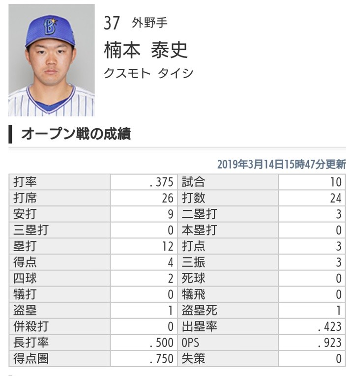 楠本 泰史(De) .375(24-9) 出塁率.423 OPS.923