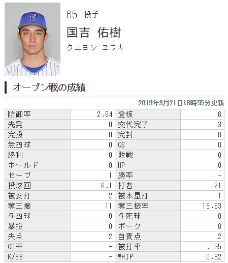 6登板 防御率2.84 6.1回 11奪三振 0四死球