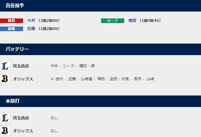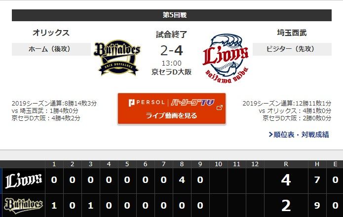 2019.4/28-試合結果【西武×オリックス】(京セラドーム大阪)は4-2で西武が勝ち!!栗山が逆転タイムリー!!先発今井が7回2失点で2勝目!!