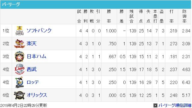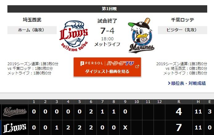2019.4/2-試合結果【西武×ロッテ】(メットライフドーム)は7-4で西武が勝ち!!先発ニールが来日初先発で初勝利!!山川が3号ソロ&森が4打点と大活躍!!