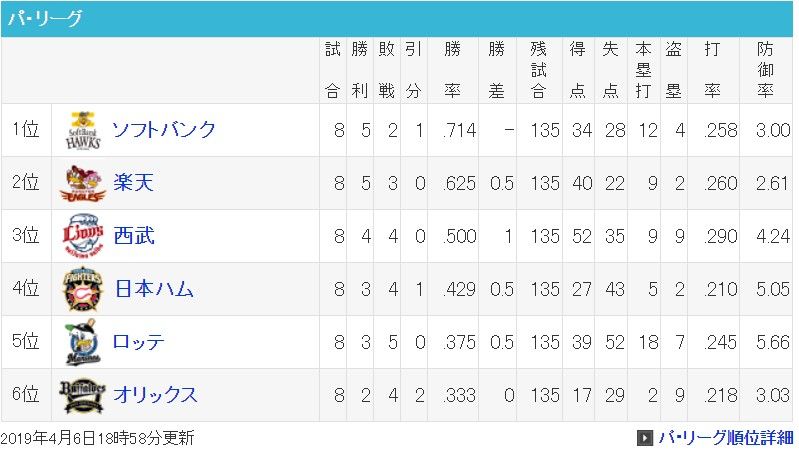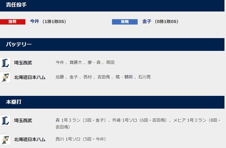 2019.4/6-試合結果【西武×日本ハム】(東京ドーム)は16-3で西武が勝ち!!先発今井が7回5安打3失点の好投で今季初勝利!佐藤龍世がプロ初安打!打線は今季初2桁安打の19安打16得点の大勝!