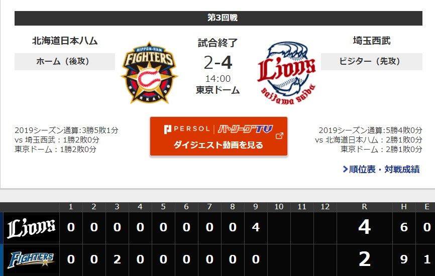 2019.4/7-試合結果【西武×日本ハム】(東京ドーム)は4-2で西武が勝ち!!高橋光成が9回2失点の好投!!9回に森のタイムリー&外崎の2号3ランで西武が逆転勝ち!!カード勝ち越し!