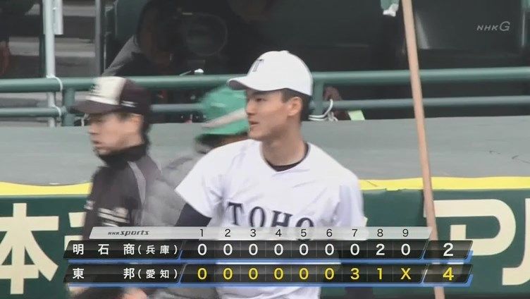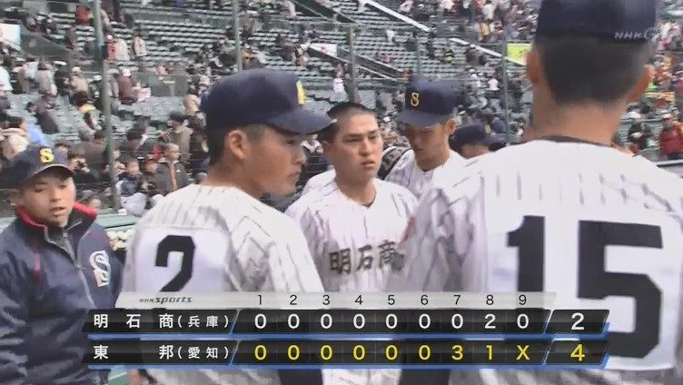 だが、その裏、東邦は追加点を奪ってリードを広げた。1死から松井が四球で出塁。続く杉浦のバントは小飛球となった。明石商の捕手・水上は併殺を狙ってあえてバウンドさせ、一塁へと送球。だが、これを一塁手が弾き、さらには二塁への送球が打者走者に当たって悪送球になり、一塁走者が一気に生還。エース石川が9回を無失点に切り抜け、勝利を掴んだ。