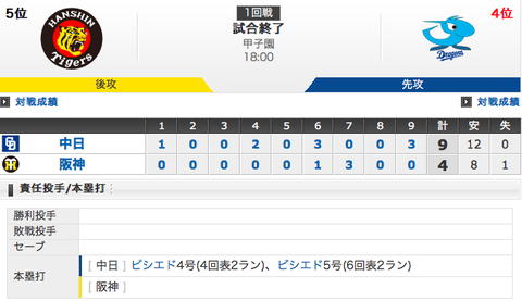 【試合結果】中日 9-4 阪神 今季初連勝!ビシエドが2発4打点で強竜打線を牽引!!中継ぎ陣が踏ん張り勝率5割復帰!!!