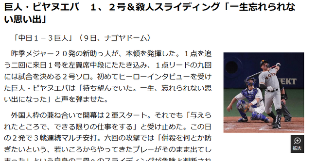 初めてヒーローインタビューを受けた巨人・ビヤヌエバは「待ち望んでいた。一生、忘れられない思い出になった」と声を弾ませた。