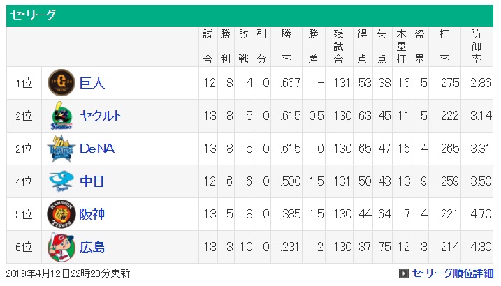 横浜DeNAベイスターズ 8勝5敗 投手WAR+2.7(1位) 得点65(1位)