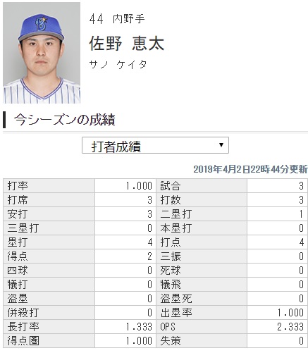 ⚾️ヤクルト×DeNA 1回戦 神宮球場 代打佐野恵太 センター前同点タイムリーヒット‼️ 開幕から打率10割キープ! (2019.4.2) #baystars pic.twitter.com/Tk3hoRO5yC — Deファン (@DeNA_2017) 2019年4月2日