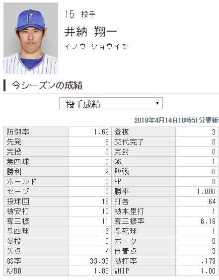 3試合2勝0敗 16回 防御率1.69 WHIP1.00