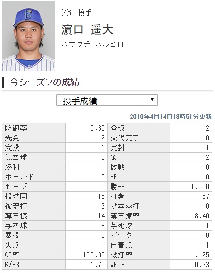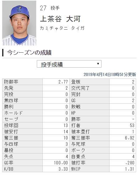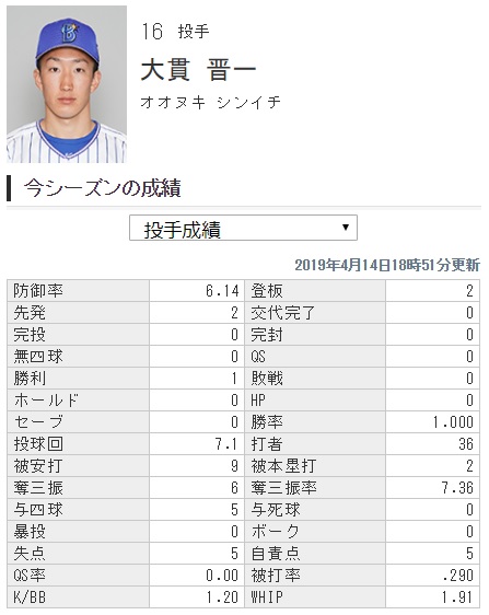 2試合1勝0敗 7.1回 防御率6.14 WHIP1.91