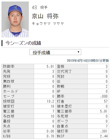 3試合0勝2敗 10.2回 防御率5.91 WHIP2.44