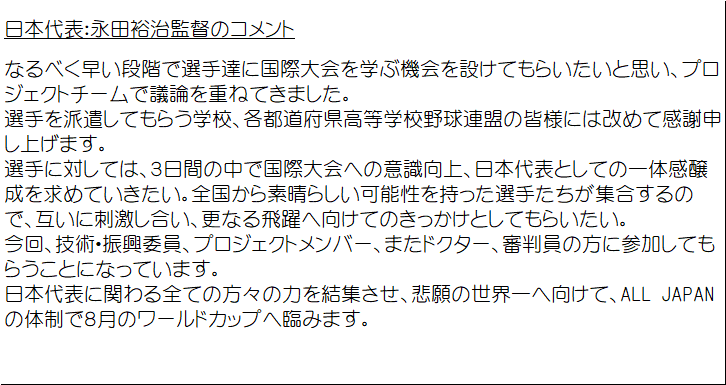国際大会へ向けた心構え、ルール、マナー、木製バットへの対応などが合宿の目的です⚾#熱闘#高校野球#日本代表 候補#メンバー pic.twitter.com/shZggQ4mmp