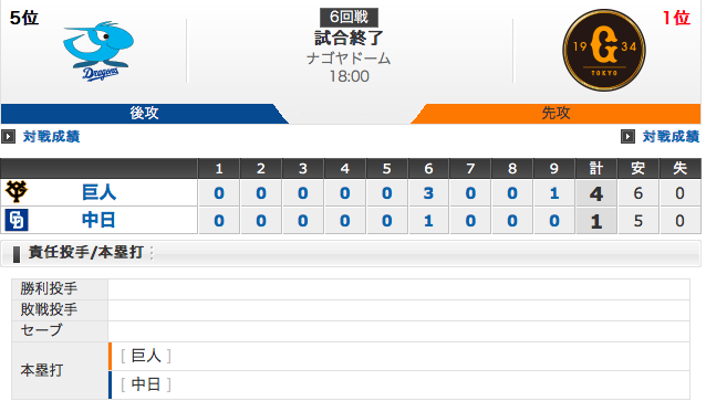 【試合結果】中日 1-4 巨人 ナゴヤドームにも伏兵