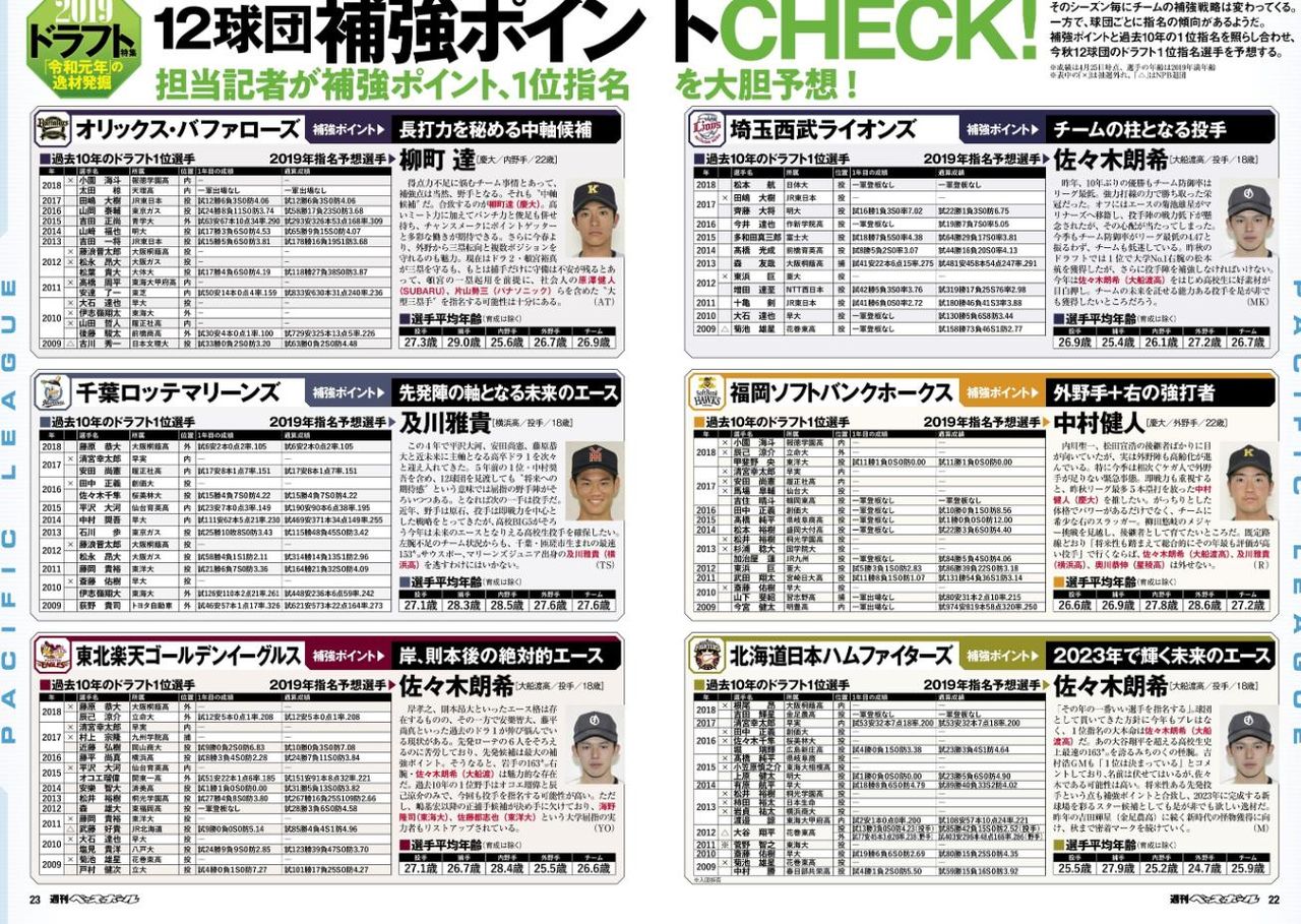 週べ12球団ドラフト補強ポイント&候補